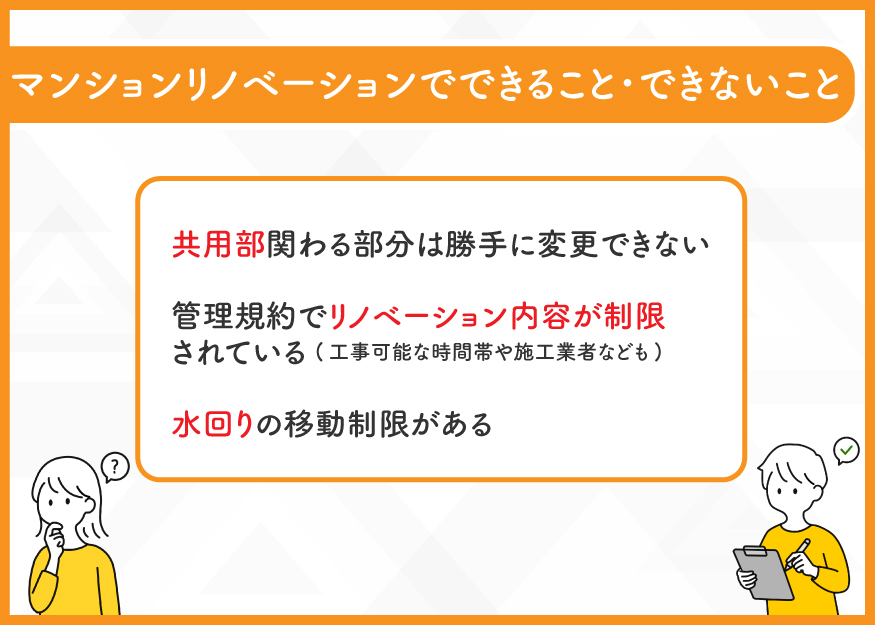 水回りの交換や内装の張り替えなどは可能ですが、間取り変更を伴うフルリノベーションは難しいため、優先順位を決めて進めることが大切です。